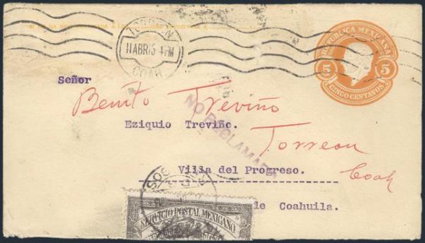 3496   imageUsed 5ยข orange Postal Stationery envelope with Torreon, Coah 11 Apr 1913 cancel addr domestically, returned undelivered "NO RECLAMADO". Has Officially Sealed label folded over edge & 3 "LSITA / TORREON violet b/s's (diff dates). F-VF. Interesting (Image) Estimate 45.00+ $Cdn