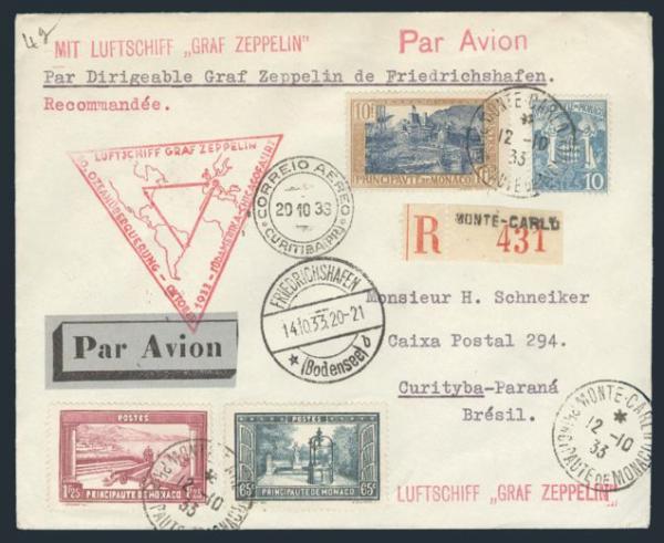 3501 64, 92, 117, 121 image64, 92, 117, 121, Tied on cach Reg'd GRAF ZEPPELIN Oct 1933 Chicago Exposition Flight cover addr to Curityba, Brazil (20 Oct b/s). Has Marseilles transit & 2 red "MIT LUFTSCHIFF GRAF ZEPPELIN" h/s's. VF. A SCARCE ZEPPELIN COVER. VF (Image) Estimate 750.00+ $Cdn