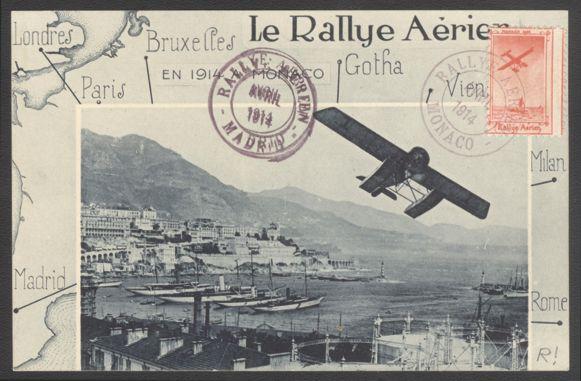 3522   image"Rallaye Aerien / Monaco 1914" red flight vignette depicting float-plane over sea tied by matching violet 2-Ring cancel on b/w photo postcard depicting map of Europe & Monaco harbour. Has "Rally Aerien / Madrid" receiver. VF. Scarce pioneer aviation item (Image) Estimate 165.00+ $Cdn