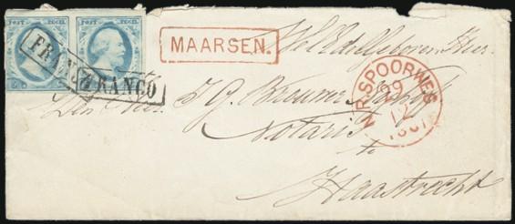 3571 1 image1 (Pair) light blue shade, Tied by boxed franco cancels on cover to Haastrecht. Has red boxed "MAARSSEN" h/s and N.R. SPOORWEG 29 1861 CDS; plus black s/l "MAARSSEN" b/s. F, roughly opened at top (Image) Estimate 175.00 $Cdn