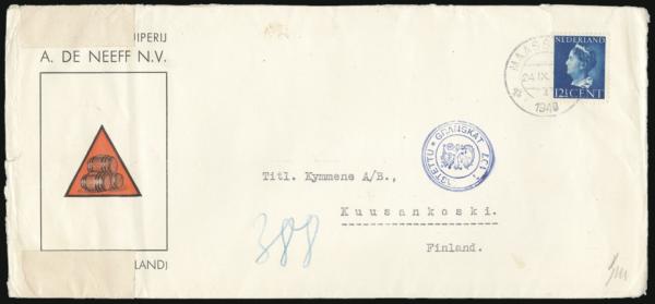 3585 219 image219, Tied by Maashees 24 Sept 1940 CDS on WWII German Occupation Censored colour illustrated advertising cover for BREWING Co. Addr to Finland. Has German censor tape & Finnish censor h/s. F, some edge wear, etc (Image) Estimate 45.00+ $Cdn