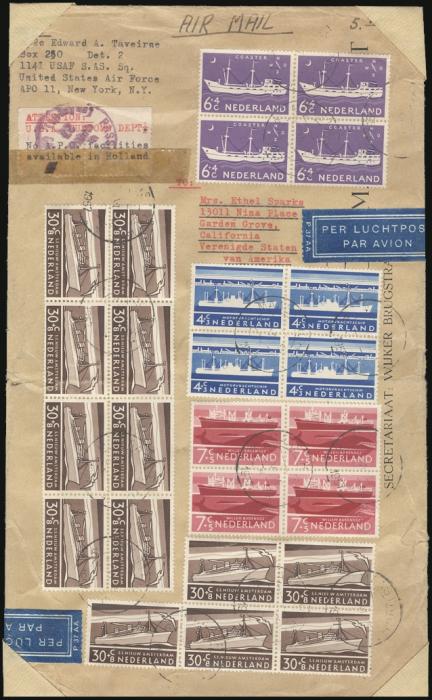 3587 283, B306-9, B310 image283, B306-9 (Blocks), B310 (15), Tied front & reverse by Maastricht June 1957 CDS's on large size airmail cover to USA from Air Force Serviceman, APO 11. Has interesting typed label "No APO facilities available in Holland". Fascinating multi-franked item. VG-F, some flts (Image) Estimate 75.00+ $Cdn