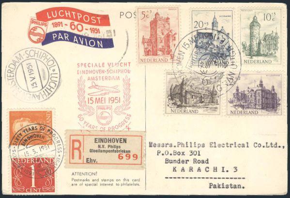 3586 282, 308, B224-8 image282, 308, B224-8, Tied by special PHILIPS 60 YEARS of PROGRESS 15 May 1951 FD cancels on matching Reg'd colour illustrated souvenir postcard to Philips, Co., Pakistan. Card is also Amsterdam to Schiphol FFC with matching airmail etiquette. Card depicts Eindhoven. F-VF (Image) Estimate 60.00+ $Cdn