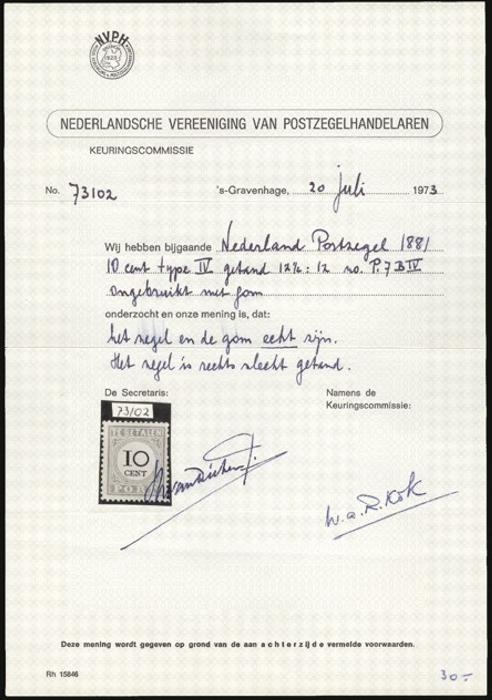 3602 J7c imageJ7c, Rare 10c postage due TYPE IV. F-VF, OG, some short perfs. Has 1991 Muis Certificate & 1973 NVPH Certificate. A VERY SCARCE STAMP (Image) (View Certificate)