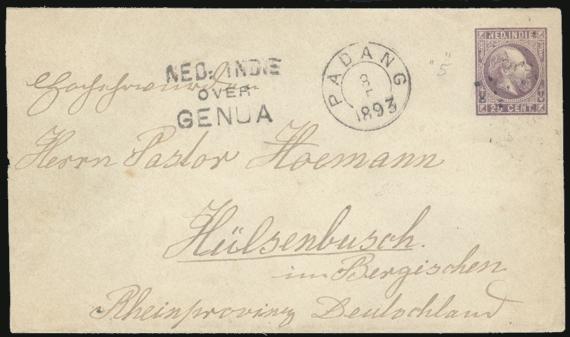 3609   imageKing William 25¢ postal stationery envelope with "5" dotted diamond cancel from Padang, 8 May 1893 CDS to Germany. Has 3-line "NED: INDIE/OVER/GENOA" ship transit and Hulsenbusch 15 June b/s. F, some of side back flap missing (Image) Estimate 50.00+ $Cdn