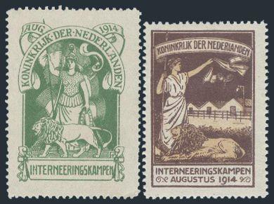 3603   imageScarce set of two diff 1916 WWI Internment Camp stamps. F-VF, NH, natural gum wrinkles and inclusions. Due to Dutch neutrality both Belgian & German soldiers were interned in the Netherlands during WWI. An interesting part of WWI history! (Image) Estimate 600.00+ $Cdn