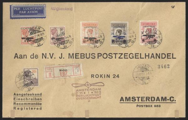 3607 C1-5 imageC1-5, Complete first Airmail set tied by Medan 31 Dec, 1929 CDS's on Reg'd Airmail flight cover to Amsterdam. F, vert fold not affecting stamps (Image) Estimate 50.00+ $Cdn