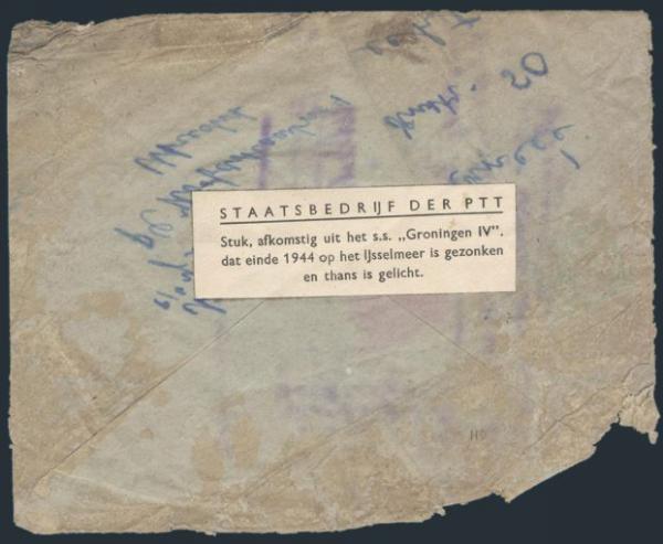 3611   imageStampless banking business reply cover, Tweede Exloermond to Utrecht from the "SS GRONINGEN IV" SHIPWRECK 8 Jan, 1945. The Groningen collided with the steamer "Jan Nieveen" with a loss of 50 lives. The ship was raised 4 Sept 1946. Cover has official label affixed on reverse stating above. VG+, stamp floated off, water damaged. A write-up accompanies. Scarce shipwreck cover (Image) Estimate 250.00+ $Cdn