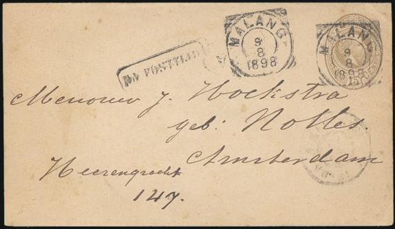 3610   imageKing William 15¢ postal stationery envelope with Melany 9 Aug 1898 squared circle cancel to Amsterdam, 16 Sept b/s. Has boxed "NA POSTTIJD" h/s & Soerbaja & Weltevreden squared circle transits. F (Image) Estimate 45.00+ $Cdn