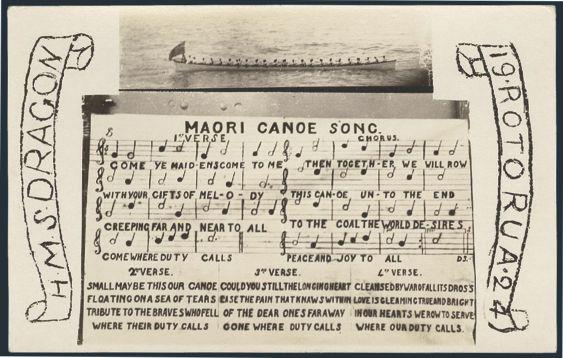 photo postcard issued for the HMS DRAGON at Roto Rua 1924. Depicts the musical notes & words of the MAORI CANOE SONG along with a picture of a Maori Canoe. VF. AN UNUSUAL ITEM