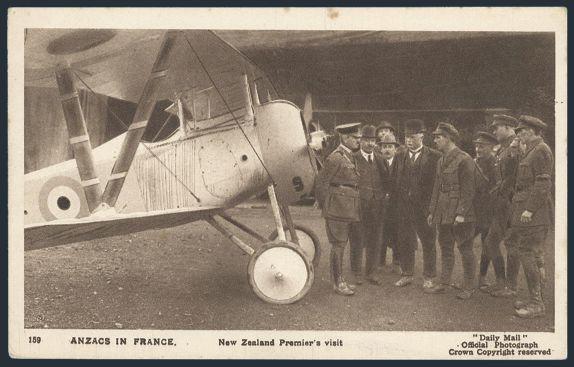 sepia postcard depicting the NEW ZEALAND PREMIER'S VISIT to the front. Depicts The Rt. Hon W. F. Massey and Sir Joseph Ward with ANZAC soldier beside a Fighter Airplane. This was a "Daily Mail" official war photo. VF (Image)