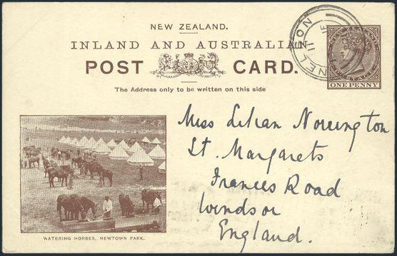 Penny Postal Stationery card cancelled at Nelson 1901 with Wellington flag cancel on reverse. Depicts a scene of the Military Contingent Camp before departing to South Africa during the Boer War. F (Image)