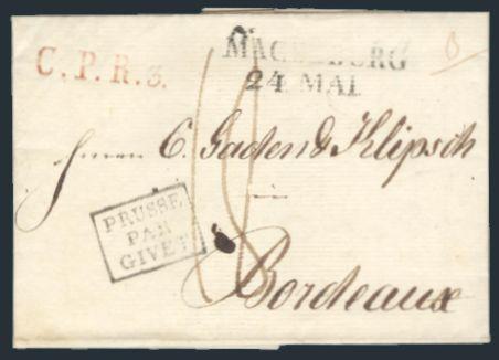 3962   imageStampless folded letter with "MAGDEBURG / 24 MAI" (1818) 2-line cancel to Bordeaux, France. Has red "C.P.R.3" accounting strike, black boxed "PRUSSE / PAR / GIVET" entry to France h/s & 18 Mark m/s rate. VF (Image) Estimate 40.00+ $Cdn
