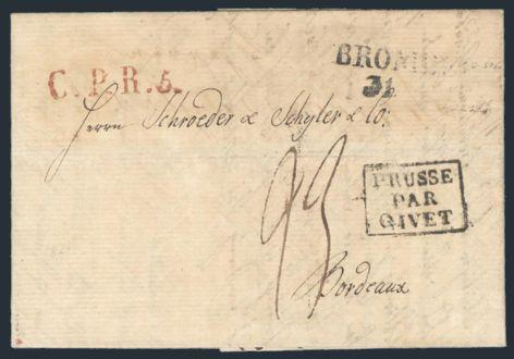 3964   Stampless folded letter dated 3 Sept 1821 with 2-line "ELBING / 3 SEPT" cancel to Bordeaux, France. Has red "C.P.R.5." accountancy h/s, black boxed "PRUSSE / PAR /GIVET" cross-border h/s & 25 Mark m/s rate. VF Estimate 40.00+ $Cdn