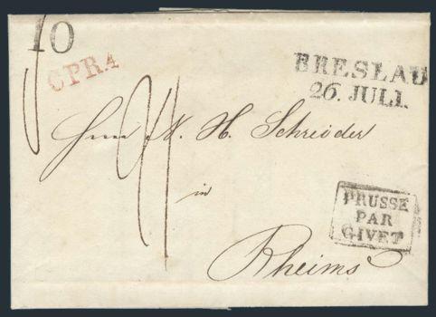 3965   imageStampless folded letter with "BRESLAU / 26 JULI" (1829) 2-line cancel to Rheims, France. Has red "CPR4" accountancy h/s, black boxed "PRUSSE / PAR / GIVET" cross border h/s & "10" hammer rate. VF (Image) Estimate 40.00+ $Cdn