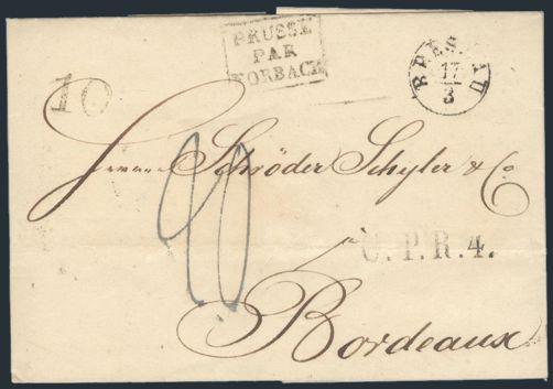 3966   imageThree stampless folded letters from 1832-4 from Breslau, Elberfeld & Magdeburg to Bordeaux, France. Have C.P.R. accountancy h/s's, boxed cross border h/s's, various m/s rates, etc. Write-ups accompany each cover. VF (Image) Estimate 100.00+ $Cdn