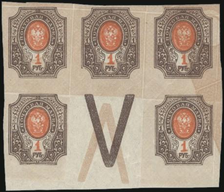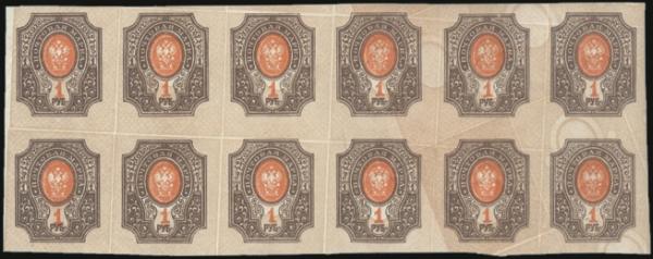4010 131, 131d image131, 131d, One Ruble horiz Imperf block of 12 with the GROUNDWORK DOUBLED on 6 RIGHT STAMPS. VF, NH. Extraordinary showpiece! (Image) Cat 1,200.00+