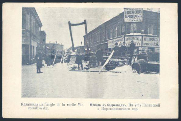 4019   imageUnused postcard circa 1905 depicting a barricaded Moscow street during the revolution. Thousands of workers joined an armed rebellion against the Imperial Gov't. They were fighting for better social conditions, etc. F (Image) Estimate 75.00+ $Cdn