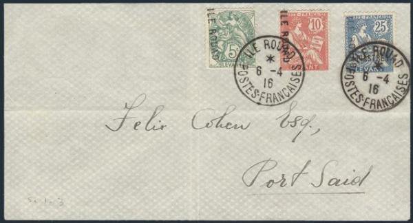 4004 1-3 image1-3, Scarce FIRST OVERPRINTED set neatly tied by bold Ile Rouad 6 April, 1916 CDS's on cover to Port Said Egypt. Has 2 diff Port Said b/s's. F, cover is a bit reduced and has a couple light folds not affecting stamps or cancels. ONE OF ONLY A FEW ROUAD COVERS WE HAVE SEEN IN OUR 50 YEARS OF AUCTIONS! Scott $3,750 US (Image) Estimate 1,000.00+ $Cdn