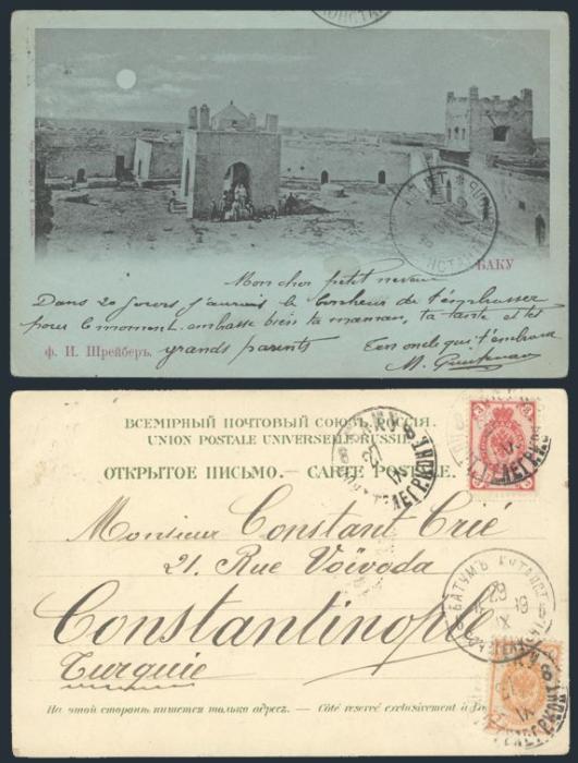 4007 46, 48 image46, 48, Tied by Baku, Azerbaijan 29 Sept 1899 CDS's on photo postcard depicting a fort at Baku. Addr to Constantinople. F-VF, interesting & unusual postcard (Image) Estimate 50.00+ $Cdn