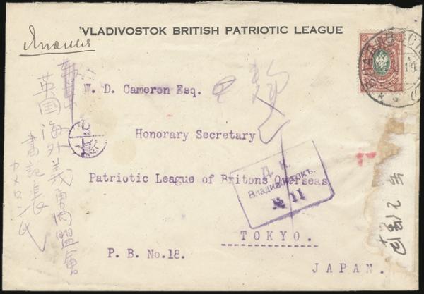 4009 84 image84, Tied by Vladivostok 21 Feb 1919 CDS on Censored cover to "Patriotic League of Britons Overseas", Tokyo. Has "Vladivostok British Patriotic League" corner card & Japanese directional m/s notations. F, corner flt. The Canadian Red Cross Society worked with the League during this period (Image) Estimate 200.00+ $Cdn