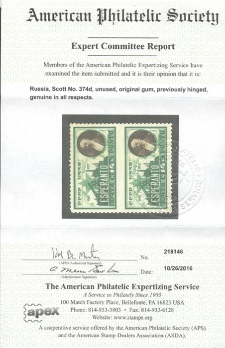 4013 374d image374d, Vert Imperf Between Pair. VF, OG. Has 2016 APS Certificate. A VERY SCARCE & SELDOM SEEN ITEM (Image) (View Certificate)