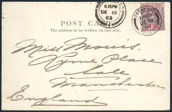4185 65 image65, 78, Collection of 7 diff postcards 1903-6 to Manchester England with rec cancels. Six of the postcards have PAQUEBOT PLYMOUTH cancels. The postcards show scenes of Sierra Leone and Canary Islands. F (Image) Estimate 275.00+ $Cdn