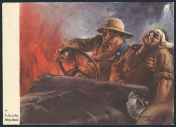 4229   imageUnused WWII colour illustrated Italian Propaganda postcard for the 3rd Auto Unit, Mogadishu depicting driver with wounded soldier in midst of battle. VF. Scarce (Image) Estimate 75.00+ $Cdn