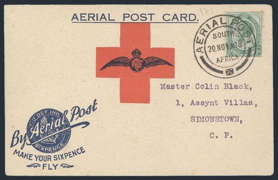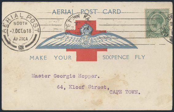 4245 2 image2, Tied on special Aerial Post / Make Your Six pence Fly Red Cross colour illustrated Patriotic postcard posted locally in Cape Town. Depicts Red Cross & Air Force Insignia. Funds raised were for wounded WWI veterans. F, some soiling, mounting traces. Scarce (Image) Estimate 200.00+ $Cdn