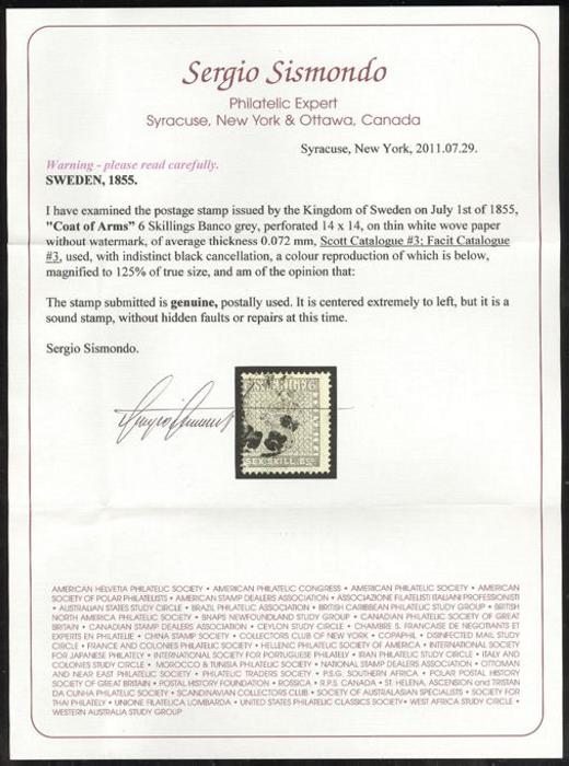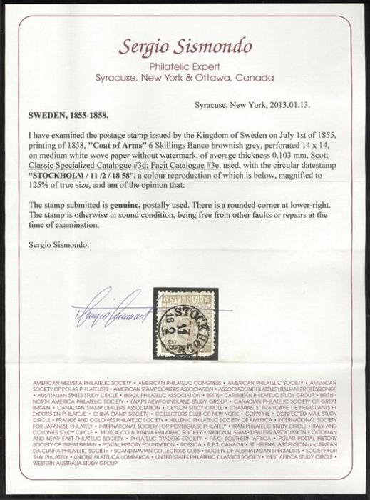 4344 3d image3d, Scarce 6s brownish gray, neat Stockholm 11 Feb, 1858 CDS cancel, nicely centered, VF, one slightly rounded corner. Has 2013 Sismondo Certificate (Image) (View Certificate)