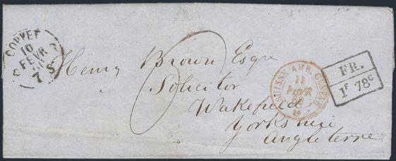 4366   imageStampless folded letter from Geneva 11 Feb 1860 to Wakefield, England. Has multiple b/s's incl various transit cancels & RPO. Also has French accounting marking. F+ (Image) Estimate 75.00+ $Cdn