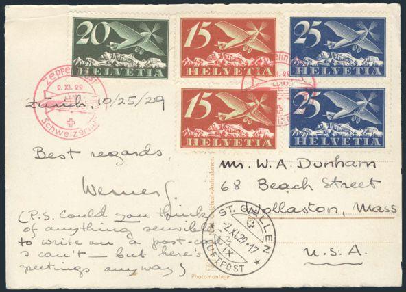 4414 C5, C9 imageC5 (2), C9, Tied on cach GRAF ZEPPELIN Dubendorf Flight 2 Nov 1929 photo postcard to USA. Has St. Gallen Mail Dropping CDS. The postcard depicts the Zeppelin Airship over Zurich. F-VF, small mounting traces (Image) Estimate 80.00+ $Cdn