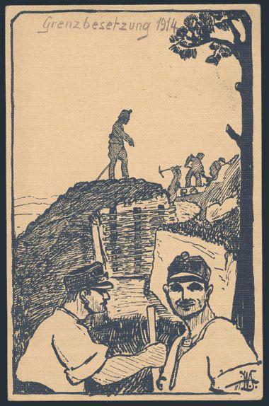 4436   imageStampless 1914 Swiss Army illustrated Patriotic feldpost card with Schutzer 6th Division cancel to Zurich. Depicts soldiers building defenses on frontier. VF (Image) Estimate 45.00+ $Cdn