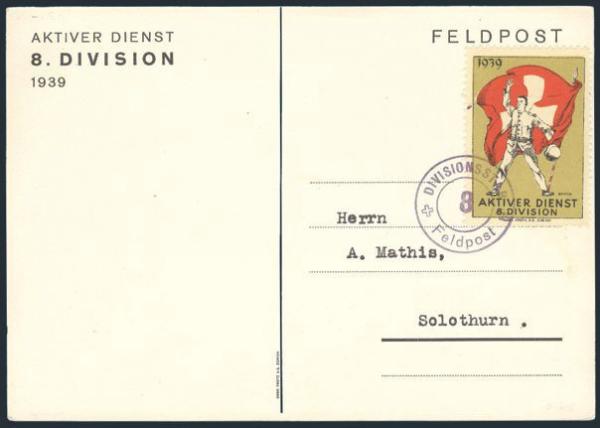 4439   imageSwiss Army 8th Division 1939 frank tied by matching Feldpost cancel on matching Feldpost card to Solothurn. Depicts soldiers tending horses. VF (Image) Estimate 40.00+ $Cdn