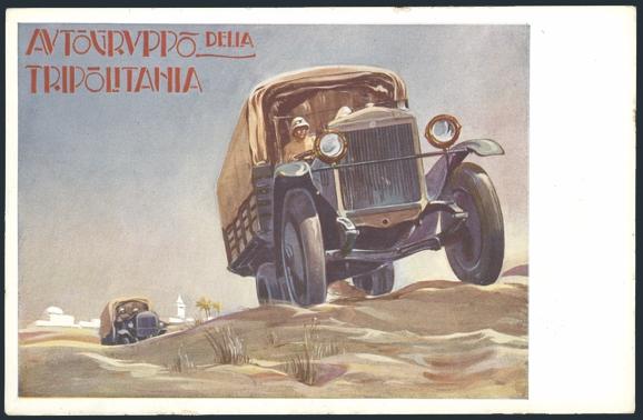 4546   imageUnused WWII colour illustrated Italian Propaganda postcard depicting military transport trucks on manoevers in the desert. F-VF (Image) Estimate 75.00+ $Cdn