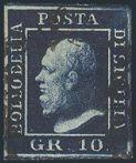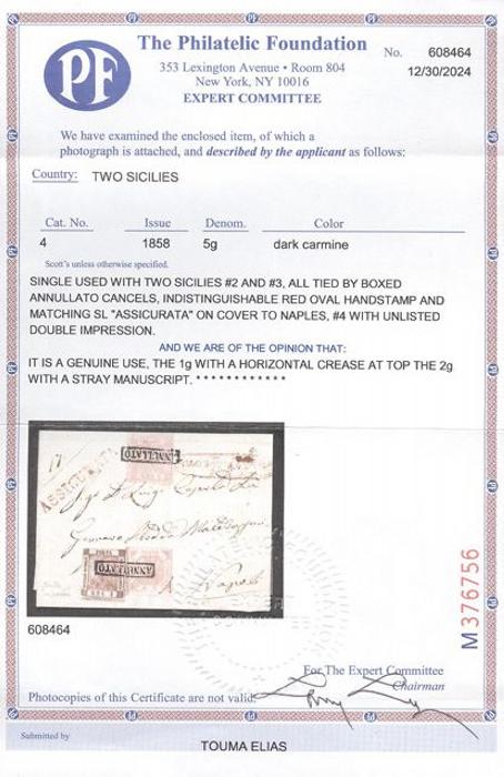 4577 2-4 image2-4, Tied by boxed "ANNULLATO" cancels on a folded 1859 cover to Naples. The #4 has an unlisted DOUBLE IMPRESSION OF THE STAMP DESIGN. F-VF, #2 has light horiz crease. A RARE DOUBLE PRINT ON COVER. Has 2024 Philatelic Foundation Certificate (Image) (View Certificate)