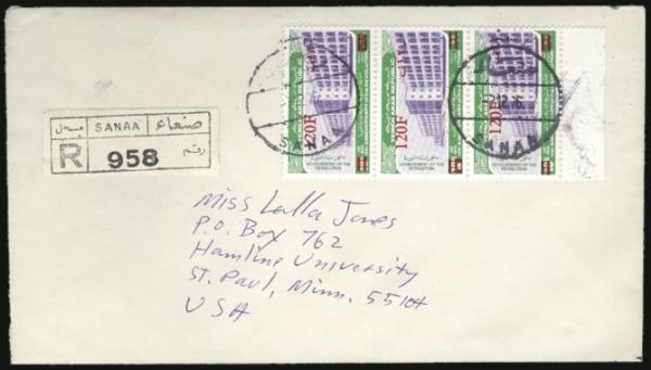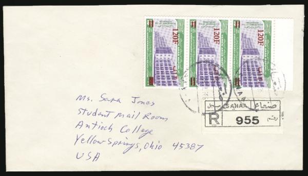 4628 C48 imageC48, Vert strip of 3 tied by Sana'a 29 Nov 1976 CDS's on Reg'd cover to USA (10 Dec b/s). Bottom stamp has UNLISTED 3-BAR overprint at right. VF (Image) Estimate 75.00+ $Cdn