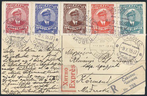 4636 131-5 image131-5, Tied by Cakovec 9 Oct 1935 bilingual cancels on Reg'd Express F.D. postcard, addr domestically. Postcard depicts Zrinski in 16th Century & in 1930's. VF. Very attractive item! (Image) Estimate 65.00+ $Cdn