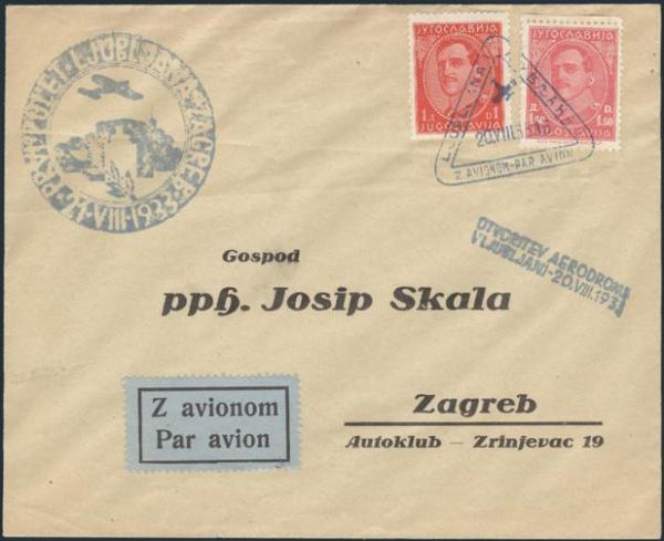 4634 67 image67, 79, Tied by special triangular cancel in blue on cacheted 21 Aug 1933 AIRMAIL FLIGHT cover Ljubljana to Zagreb. F, minor edge creases (Image) Estimate 75.00+ $Cdn