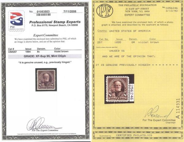 Beautiful & fresh mint 8¢ violet brown Sherman. XF, LH. Has 1992 Philatelic Foundation & 2006 PSE Certificates with the latter graded "XF-Sup 95" (Image) (View Certificate)