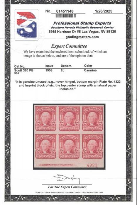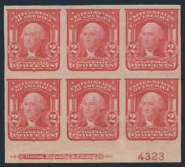 margin Plate #4323 Block of 6 with Imprint, fresh colour, VF, NH, one stamp with natural paper inclusion. Has 2025 PSE Certificate (Image) (View Certificate)