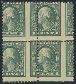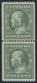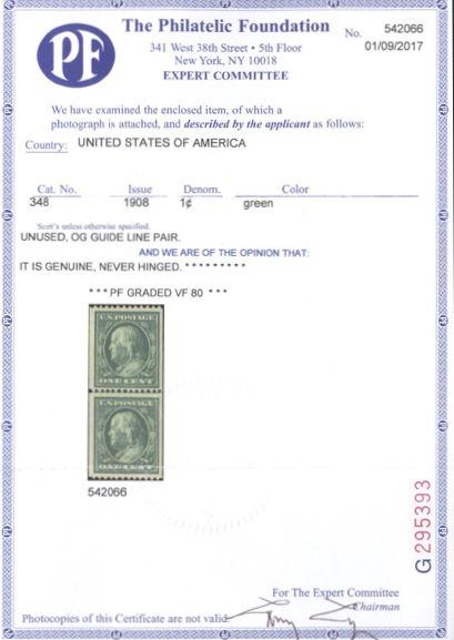 coil guide line pair of the 1¢ green Franklin. Beautiful centering, VF, NH. Has 2017 Philatelic Foundation Certificate graded "VF 80" (Image) (View Certificate)