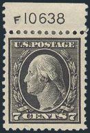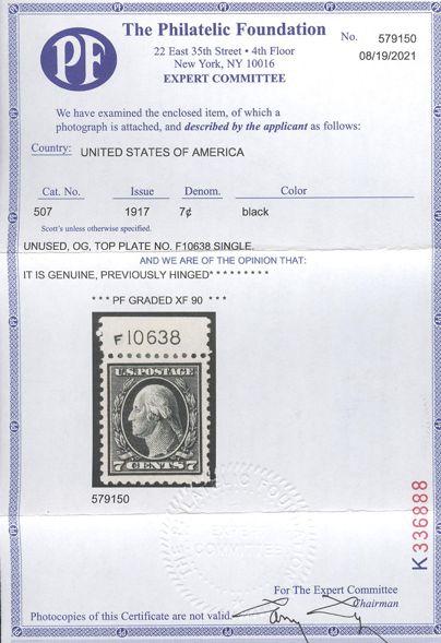 Gorgeous top margin Plate Number single of the 7¢ black Washington. XF. Has 2021 Philatelic Foundation Certificate graded "XF 90" (Image) (View Certificate)