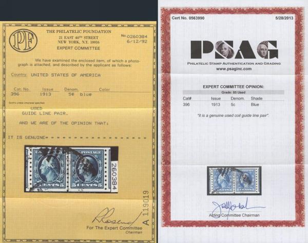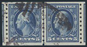 Gorgeous used coil guideline pair of the 5¢ blue Washington. VF-XF, neat duplex cancel. Has 1992 Philatelic Foundation & 2013 PSAG Certificates with the latter graded "85"