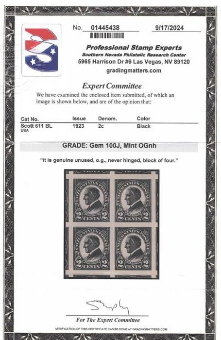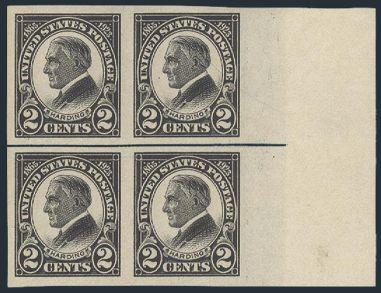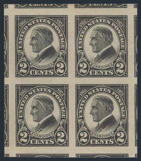 Imperforate 2¢ Harding GEM block with huge margins showing adjoining stamps on all sides. Has 2024 PSE Certificate graded GEM 100J (Image) (View Certificate)