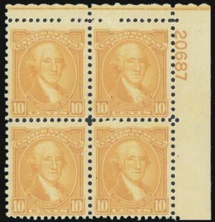 Plate Blocks of the 10¢ Washington. F-VF, 2 are NH (Image)