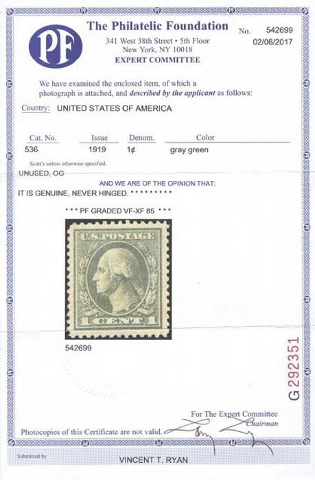 Attractive mint 1¢ gray green Washington. VF-XF, NH. Has 2017 Philatelic Foundation Certificate graded "VF-XF 85" (Image) (View Certificate)
