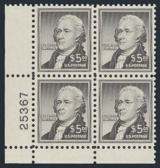 Plate Block of the $5 Hamilton, perfectly centered, pristine fresh, XF, NH (Image)