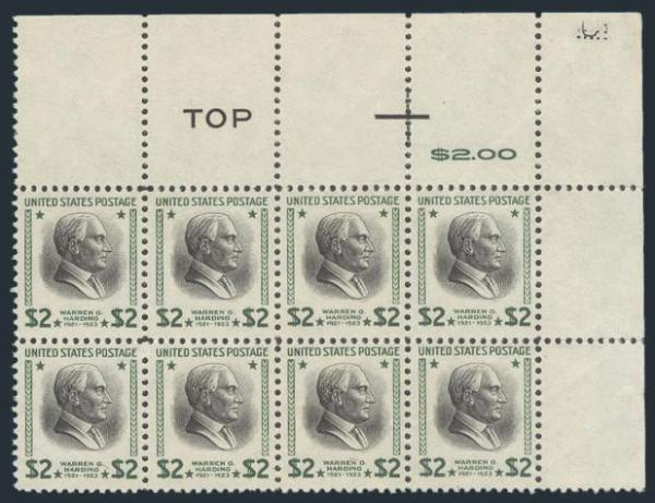 Harding UR corner block of 8 with "TOP" and "$2.00" imprints. VF, NH, natural short gumming in the selvedge (Image)