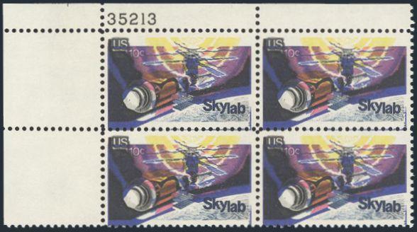 Plate Block of the 10¢ Skylab with MAJOR COLOUR SHIFT errors. VF, NH. Quite eye-catching! (Image)